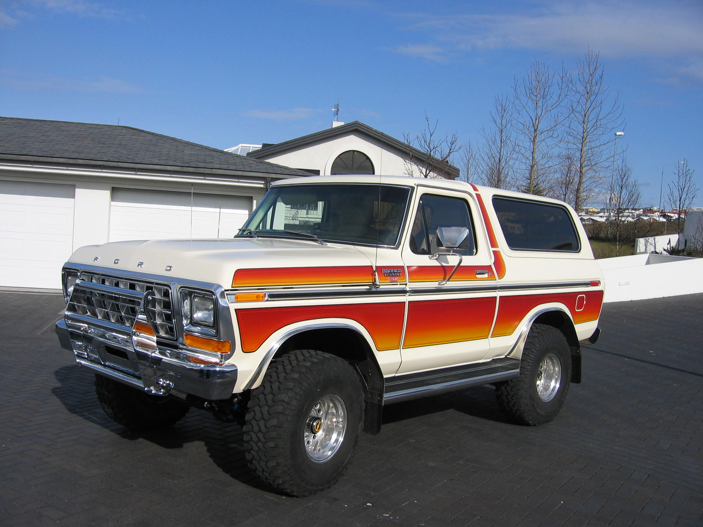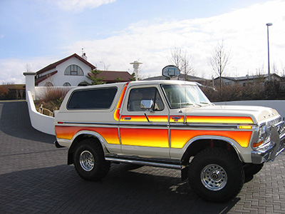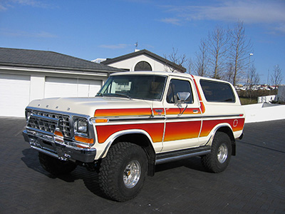 Bronco 1979 endursmíðaður af Gísla. Endursmíðin var gerð algjörlega með “original” (NOS(new old stock)) íhlutum og tók um það bil 3000 klukkustundir í tvö ár. Límborðar á hliðum eru endurskinsborðar gerðir eftir forskrift frá upprunalegum borðum (“free wheeling package” frá Ford). Prentsmiðja í Sarasota Florida framleiddi borðana með upprunalegu tækninni sem Ford gerði á sínum tíma (silkiprentun) þar sem hver litur er prentaður hvern ofan á annan en ekki bleksprautuprentun. Undirlagsefnið er gulur dúkur frá 3M sem er notaður almennt í umferðarskilti. Þess vegna er endurskin af borðunum þegar tekin er mynd með flassi eins og sést á annarri myndinni.